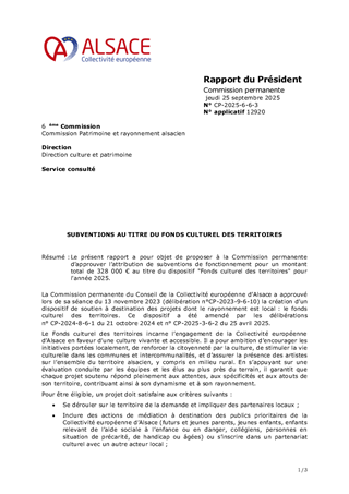 Le présent rapport a pour objet de proposer à la Commission permanente d’approuver l’attribution de subventions de fonctionnement pour un montant total de 328 000 € au titre du dispositif "Fonds culturel des territoires" pour l'année 2025.