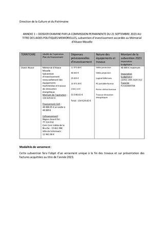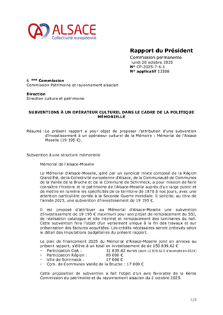 Le présent rapport a pour objet de proposer l'attribution d'une subvention d'investissement à un opérateur culturel de la Mémoire : Mémorial de l'Alsace Moselle (19 195 €).