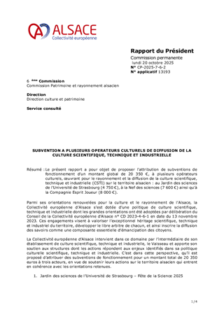 Le présent rapport a pour objet de proposer l'attribution de subventions de fonctionnement d'un montant global de 20 350 €, à plusieurs opérateurs culturels, œuvrant pour le rayonnement et la diffusion de la culture scientifique, technique et industrielle (CSTI) sur le territoire alsacien : au Jardin des sciences de l'Université de Strasbourg (4 750 €), à la Nef des sciences (7 600 €) ainsi qu'à la Compagnie Esprit Joueur (8 000 €).