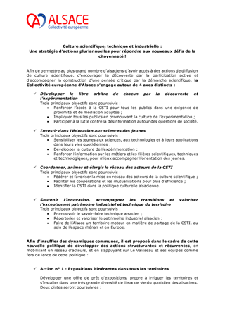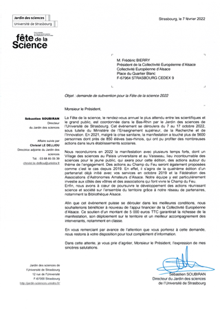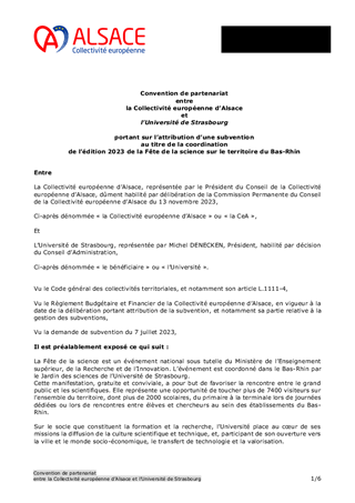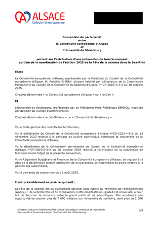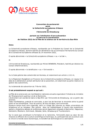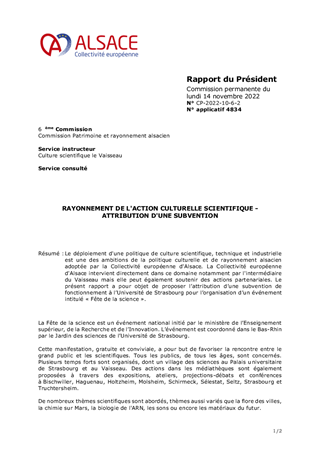 Le déploiement d'une politique de culture scientifique, technique et industrielle est une des ambitions de la politique culturelle et de rayonnement alsacien adoptée par la Collectivité européenne d'Alsace. La Collectivité européenne d'Alsace intervient directement dans ce domaine notamment par l'intermédiaire du Vaisseau mais elle peut également soutenir des actions partenariales. Le présent rapport a pour objet de proposer l’attribution d’une subvention de fonctionnement à l’Université de Strasbourg pour l’organisation d’un événement intitulé « Fête de la science ».
