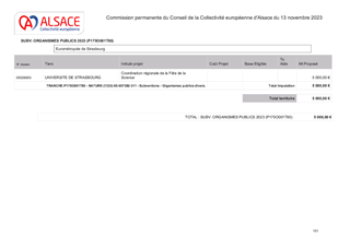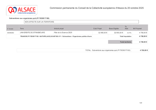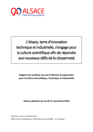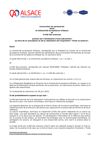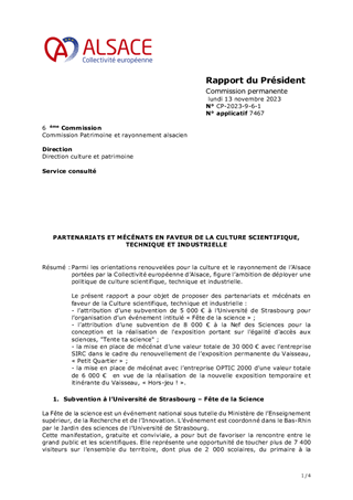 Parmi les orientations renouvelées pour la culture et le rayonnement de l’Alsace portées par la Collectivité européenne d’Alsace, figure l’ambition de déployer une politique de culture scientifique, technique et industrielle. Le présent rapport a pour objet de proposer des partenariats et mécénats en faveur de la Culture scientifique, technique et industrielle : - l’attribution d’une subvention de 5 000 € à l’Université de Strasbourg pour l’organisation d’un événement intitulé « Fête de la science » ; - l’attribution d’une subvention de 8 000 € à la Nef des Sciences pour la conception et la réalisation de l'exposition portant sur l'égalité d'accès aux sciences, "Tente ta science" ; - la mise en place de mécénat d’une valeur totale de 30 000 € avec l’entreprise SIRC dans le cadre du renouvellement de l’exposition permanente du Vaisseau, « Petit Quartier » ; - la mise en place de mécénat avec l’entreprise OPTIC 2000 d’une valeur totale de 6 000 € en vue de la réalisation de la nouvelle exposition temporaire et itinérante du Vaisseau, « Hors-jeu ! ».