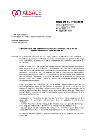 Le patrimoine alsacien est un enjeu majeur d’attractivité du territoire. La Collectivité européenne d'Alsace souhaite accompagner les porteurs de projet dans l'entretien, la restauration et la valorisation du patrimoine emblématique de l'Alsace. Entre 2019 et 2022, les projets de restauration du patrimoine représentent un total de plus de 35 M € de travaux, permettant ainsi une activité économique, avec des corps de métiers aux savoir-faire uniques comme les facteurs d’orgue, puisatiers, vitraillistes, etc. On recense en Alsace 74 entreprises labellisées « Entreprises Patrimoine Vivant ». La restauration du patrimoine joue également sur l’attractivité touristique. Une étude nationale de la Fondation du Patrimoine estime qu’un euro investit dans le patrimoine générerait jusqu’à 21€ de retombées économiques. C’est pourquoi, en parallèle de la stratégie d’accompagnement et de contractualisation avec les territoires, il convient de mettre en œuvre les dispositifs dédiés à la préservation du patrimoine bâti, par anticipation de la politique patrimoniale dont la déclinaison sera soumise au vote de l’Assemblée courant 2023, notamment pour les politiques concernant les châteaux forts et les maisons alsaciennes. S'appuyant sur l’expertise du service du Patrimoine, l'accompagnement à la restauration du patrimoine est envisagé dans sa globalité, il est proposé d'adopter : - le Plan Patrimoine Emblématique de l’Alsace pour des projets d’envergure pour lesquels l’intervention d’entreprises spécialisées est nécessaire ; - soutien pour les associations de veilleurs du patrimoine pour des projets associatifs inscrits dans la durée et mobilisant des chantiers de bénévoles. Le présent rapport définit le cadre d'intervention et les critères de ces deux dispositifs.