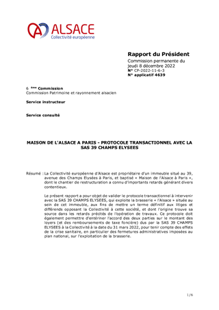 La Collectivité européenne d’Alsace est propriétaire d’un immeuble situé au 39, avenue des Champs Elysées à Paris, et baptisé « Maison de l’Alsace à Paris », dont le chantier de restructuration a connu d’importants retards générant divers contentieux. Le présent rapport a pour objet de valider le protocole transactionnel à intervenir avec la SAS 39 CHAMPS ELYSEES, qui exploite la brasserie « l’Alsace » située au sein de cet immeuble, aux fins de mettre un terme définitif aux litiges et différends opposant la Collectivité à cette société, et dont l’origine trouve sa source dans les retards précités de l’opération de travaux. Ce protocole doit également permettre d’entériner l’accord des deux parties sur le montant des loyers (et des remboursements de taxe foncière) dus par la SAS 39 CHAMPS ELYSEES à la Collectivité à la date du 31 mars 2022, pour tenir compte des effets de la crise sanitaire, en particulier des fermetures administratives imposées au plan national, sur l’exploitation de la brasserie.