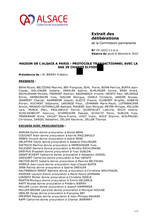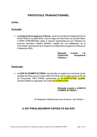 MAISON DE L'ALSACE A PARIS - PROTOCOLE TRANSACTIONNEL AVEC LA SAS 39 CHAMPS ELYSEES