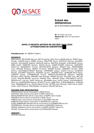 SUBVENTIONS AU TITRE DU SOUTIEN AUX OPÉRATEURS CULTURELS ALSACIENS DE LA CRÉATION, DE LA DIFFUSION ET DES PRATIQUES ARTISTIQUES, VALIDATION DU CAHIER DES CHARGES DE L'APPEL A PROJETS ARTISTE EN COLLEGE