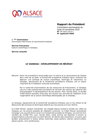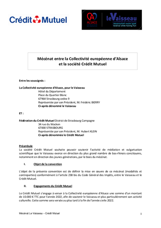 Parmi les orientations renouvelées pour la culture et le rayonnement de l’Alsace dont vient de se doter la Collectivité européenne d’Alsace figure l’ambition de déployer une politique de culture scientifique, technique et industrielle. Le Vaisseau, équipement de la Collectivité européenne d'Alsace, est un acteur important de la médiation culturelle scientifique. Par la recherche d’optimisation de ses ressources de financement, le Vaisseau s’ouvre à des partenariats permettant de stimuler des actions de mécénat afin d’accompagner le développement de ses actions. Pour l’année 2022, la société Crédit Mutuel souhaite renouveler son soutien aux activités de médiation et de vulgarisation de la culture scientifique développées par le Vaisseau.
