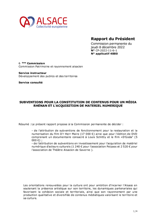 Le présent rapport propose à la Commission permanente de décider : - de l’attribution de subventions de fonctionnement pour la restauration et la numerisation du film D’r Herr Maire (17 000 €) ainsi que pour l'édition de DVD comprenant un documentaire consacré à Louis Schittly et le film «D’Goda" (5 000 €) ; - de l’attribution de subventions en investissement pour l’acquisition de matériel numérique d'acteurs culturels (1 240 € pour l’association Pelpass et 2 520 € pour l’association de Théâtre Alsacien de Saverne ).