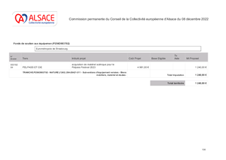 La Collectivité européenne d’Alsace partage l’ambition gouvernementale de la généralisation de l’Education artistique et culturelle (EAC) à travers l'objectif de faire accéder 100 % des jeunes aux arts et à la culture dans le cadre scolaire, objectif qui répond aux orientations pour la culture de la Collectivité notamment concernant l’ouverture et le développement de la citoyenneté au travers des pratiques culturelles. Dans ce cadre, la Collectivité européenne d’Alsace a renouvelé son dispositif « Artiste en collège », adopté par le Conseil de la Collectivité européenne d’Alsace lors de sa séance du 20 juin 2022 (n° CD-2022-06-20) pour l’année scolaire 2022/2023. Le présent rapport propose d’attribuer des subventions de fonctionnement pour un montant total de 159 940 € au titre de cet appel à projets. Il propose également d’attribuer une subvention de fonctionnement d’un montant de 750 € pour un séjour immersif en langue régionale pour 15 enfants, organisé par Saint-Louis Agglomération.