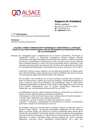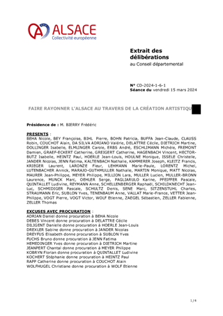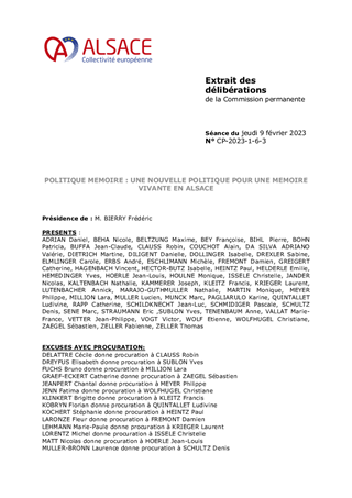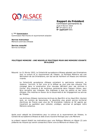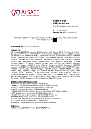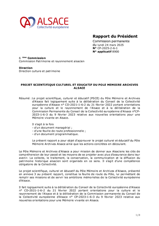 Le projet scientifique, culturel et éducatif (PSCE) du Pôle Mémoire et Archives d’Alsace fait logiquement suite à la délibération du Conseil de la Collectivité européenne d’Alsace n° CD-2021-1-6-2 du 21 février 2022 portant orientations pour la culture et le rayonnement de l’Alsace et à la délibération de la Commission Permanente du Conseil de la Collectivité européenne d’Alsace n°CP-2023-1-6-3 du 9 février 2023 relative aux nouvelles orientations pour une Mémoire vivante en Alsace. Il s’agit à la fois - d’un document managérial ; - d’une feuille de route professionnelle ; - d’un document programmatique. Le présent rapport a pour objet d'approuver le projet culturel et éducatif du Pôle Mémoire Archives Alsace ainsi que les actions concrètes en découlant.