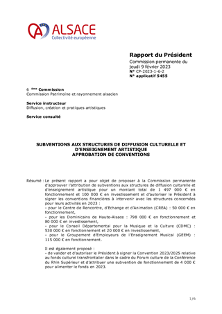 Le présent rapport a pour objet de proposer à la Commission permanente d’approuver l’attribution de subventions aux structures de diffusion culturelle et d’enseignement artistique pour un montant total de 1 497 000 € en fonctionnement et 100 000 € en investissement et d’autoriser le Président à signer les conventions financières à intervenir avec les structures concernées pour leurs activités en 2023 : - pour le Centre de Rencontre, d’Echange et d’Animation (CREA) : 50 000 € en fonctionnement, - pour les Dominicains de Haute-Alsace : 798 000 € en fonctionnement et 80 000 € en investissement, - pour le Conseil Départemental pour la Musique et la Culture (CDMC) : 530 000 € en fonctionnement et 20 000 € en investissement, - pour le Groupement d’Employeurs de l’Enseignement Musical (GEEM) : 115 000 € en fonctionnement. Il est également proposé : - de valider et d’autoriser le Président à signer la Convention 2023/2025 relative au fonds culturel transfrontalier dans le cadre du Forum culture de la Conférence du Rhin Supérieur et d’attribuer une subvention de fonctionnement de 4 000 € pour alimenter le fonds en 2023.