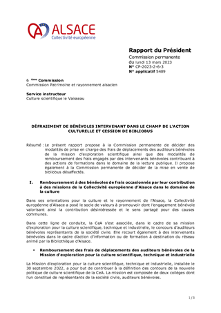 Le présent rapport propose à la Commission permanente de décider des modalités de prise en charge des frais de déplacements des auditeurs bénévoles de la mission d’exploration scientifique ainsi que des modalités de remboursement des frais engagés par des intervenants bénévoles contribuant à des actions de formations dans le domaine de la lecture publique. Il propose également à la Commission permanente de décider de la mise en vente de bibliobus désaffectés.