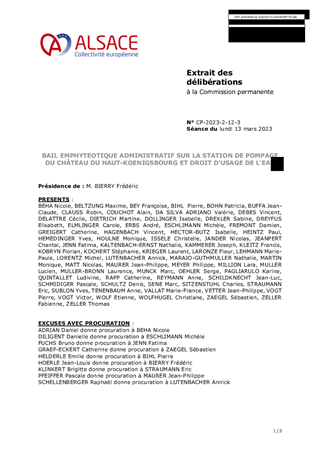 Ce rapport a pour objet de proposer à la Commission permanente de décider d’adopter un bail emphytéotique administratif, pour une durée de 50 ans à compter du 1er janvier 2023, afin de formaliser la mise à disposition de la station de pompage du château du Haut-Koenigsbourg, propriété de la ville de Sélestat et sis à ORSCHWILLER (67600), ainsi que de l’octroi du droit d’usage de l’eau y afférent, au profit de la Collectivité européenne d’Alsace.