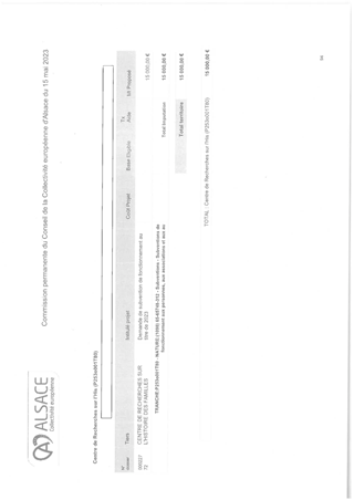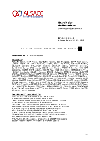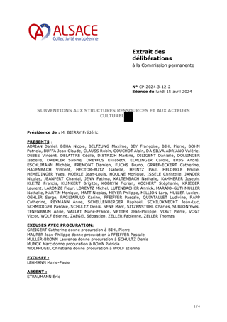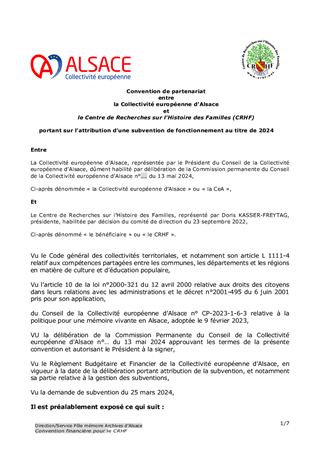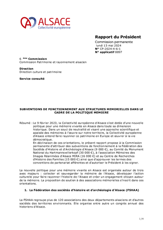 Le 9 février 2023, la Collectivité européenne d’Alsace s’est dotée d’une nouvelle politique pour une mémoire vivante en Alsace dans toute sa dimension historique. Dans un souci de neutralité et visant une approche scientifique et apaisée des mémoires à l’œuvre sur notre territoire, la Collectivité européenne d'Alsace entend faire rayonner ce patrimoine en Europe et œuvrer à la vie démocratique. En déclinaison de ces orientations, le présent rapport propose à la Commission permanente d’attribuer des subventions de fonctionnement à la Fédération des Sociétés d'Histoire et d'Archéologie d'Alsace (18 000 €), au Comité du Monument National du Hartmannswillerkopf (30 000 €), à l'association Mémoires des Images Réanimées d'Alsace MIRA (16 000 €) et au Centre de Recherches d'Histoire des Familles (15 000 €) ainsi que d'approuver les termes des conventions de partenariat afférentes et d'autoriser le Président à les signer.