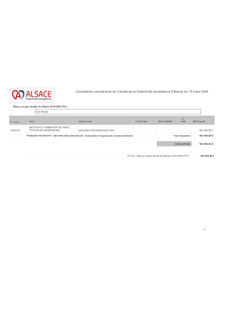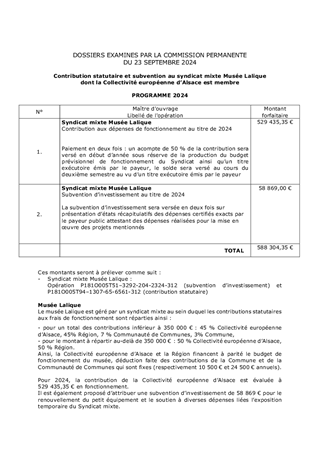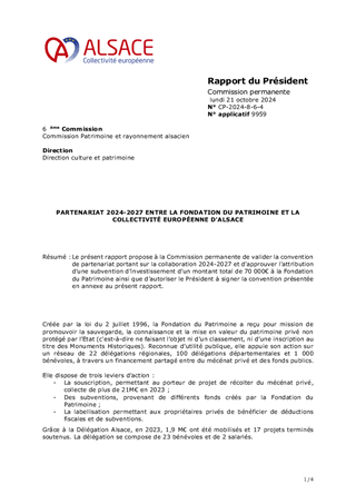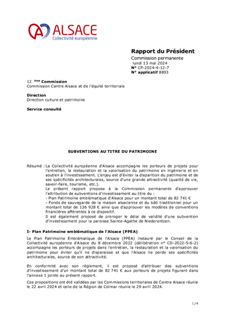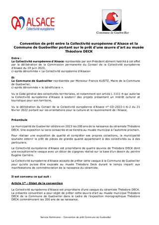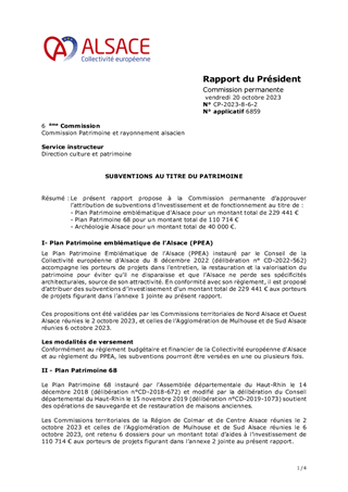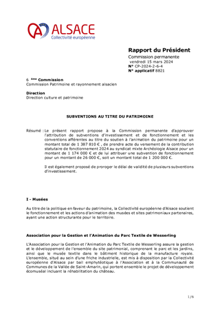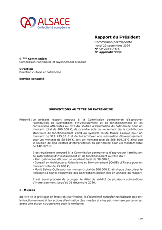 Le présent rapport propose à la Commission permanente d’approuver l’attribution de subventions d’investissement et de fonctionnement et les conventions afférentes au titre du Plan Patrimoine emblématique de l’Alsace pour un montant total de 252 091 €, au titre du soutien à l'animation du patrimoine pour un montant total de 720 000 €, ainsi que pour le soutien de cinq centres d'interprétation du patrimoine pour un montant total de 113 231 €. Il est également proposé de prêter une vasque du céramiste Théodore DECK, propriété de la Collectivité européenne d'Alsace, au musée municipal de Guebwiller, de conclure la convention de prêt avec la Commune de Guebwiller, ainsi que de valider les conventions pour le subventionnement de l'Association de l'Ecomusée, de la Fondation du Patrimoine et d’autoriser le Président à signer l'ensemble des conventions présentées en annexe du rapport.