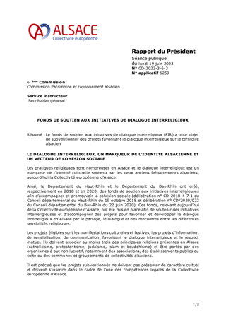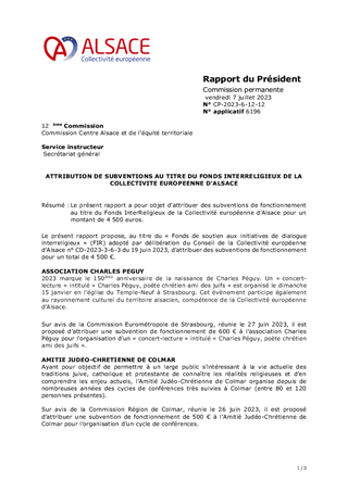 Le présent rapport a pour objet d'attribuer des subventions de fonctionnement au titre du Fonds InterReligieux de la Collectivité européenne d'Alsace pour un montant de 4 500 euros.