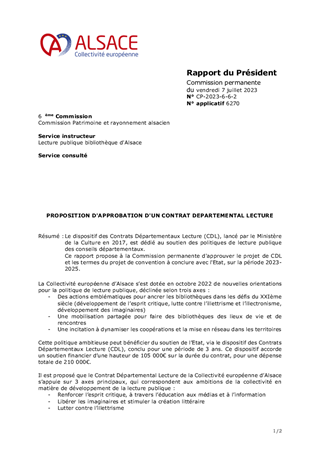 Le dispositif des Contrats Départementaux Lecture (CDL), lancé par le Ministère de la Culture en 2017, est dédié au soutien des politiques de lecture publique des conseils départementaux. Ce rapport propose à la Commission permanente d'approuver le projet de CDL et les termes du projet de convention à conclure avec l'Etat, sur la période 2023-2025.