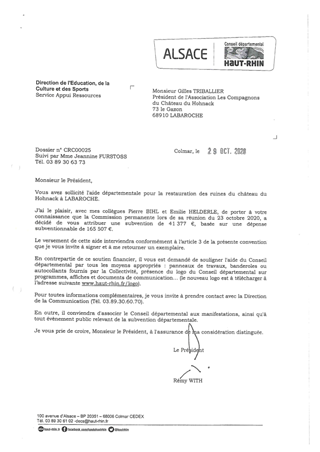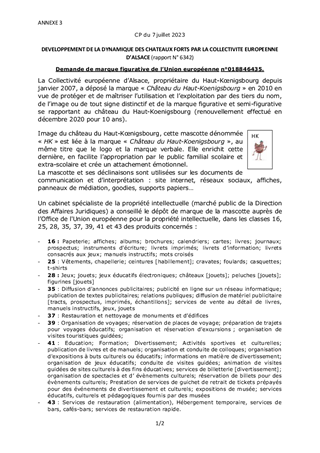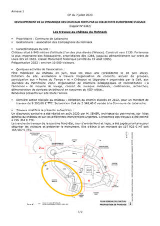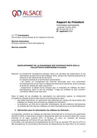 La Collectivité européenne d'Alsace mène une politique de préservation et de valorisation du patrimoine des châteaux forts, porteur de l'identité alsacienne et rhénane et de l'attractivité du territoire. Ce rapport propose à la Commission permanente : - de valider un changement de maîtrise d'ouvrage pour une subvention d'investissement concernant le château du Hohnack à Labaroche, et de prolonger la durée de validité de cette subvention. - d'approuver le dépôt d'une marque pour la mascotte du château du Haut-Koenigsbourg, dans le but de protéger l'image du château et d'en prévenir l'utilisation abusive par des tiers.