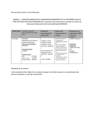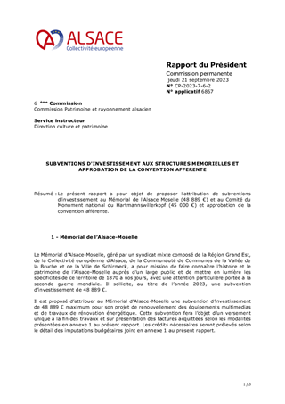 Le présent rapport a pour objet de proposer l'attribution de subventions d'investissement au Mémorial de l'Alsace Moselle (48 889 €) et au Comité du Monument national du Hartmannswillerkopf (45 000 €) et approbation de la convention afférente.