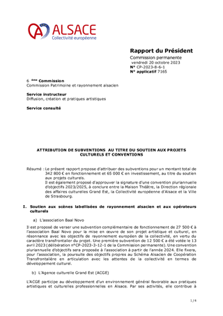 Le présent rapport a pour objet de proposer à la Commission permanente d’approuver l’attribution de subventions pour le soutien aux scènes labellisées et opérateurs de rayonnement alsacien, aux relais culturels, aux festivals d’envergure, aux opérateurs de territoires pour un montant total de 2 384 300 € en fonctionnement et 4 897 € en investissement et d'autoriser le Président à signer les conventions financières à intervenir avec les structures concernées pour leurs activités en 2023. Il est également proposé d'approuver le cahier des charges de l'appels à projets "Artiste en collège" et d'approuver les termes de la convention de partenariat à conclure avec le Groupement d'Intérêts culturels de Sarre-Union.