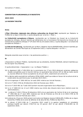 Le présent rapport propose d’attribuer des subventions pour un montant total de 342 800 € en fonctionnement et 65 000 € en investissement, au titre du soutien aux projets culturels. Il est également proposé d'approuver la signature d’une convention pluriannuelle d’objectifs 2023/2025, à conclure entre la Maison Théâtre, la Direction régionale des affaires culturelles Grand Est, la Collectivité européenne d’Alsace et la Ville de Strasbourg.