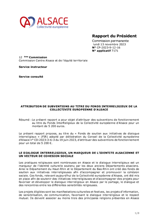 Le présent rapport a pour objet d’attribuer des subventions de fonctionnement d'un montant global de 7 975 € au titre du Fonds InterReligieux de la Collectivité européenne d’Alsace.
