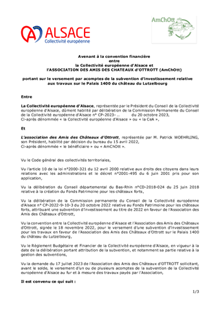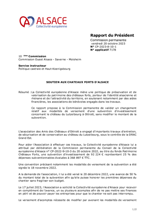 La Collectivité européenne d'Alsace mène une politique de préservation et de valorisation du patrimoine des châteaux forts, porteur de l'identité alsacienne et rhénane et de l'attractivité du territoire, en soutenant notamment par des aides financières, les associations de bénévoles engagés dans les travaux. Ce rapport propose à la Commission permanente de valider un changement relatif aux modalités de versement d'une subvention d'investissement concernant le château du Lutzelbourg à Ottrott, sans modifier le montant de la subvention.
