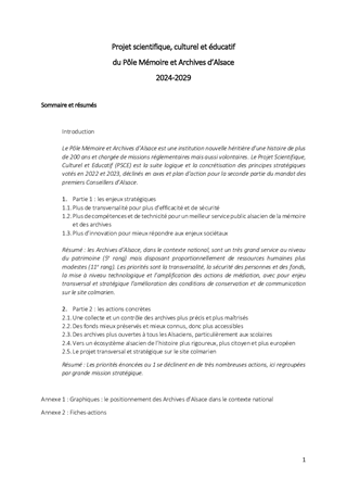 PROJET SCIENTIFIQUE CULTUREL ET EDUCATIF DU POLE MEMOIRE ARCHIVES ALSACE