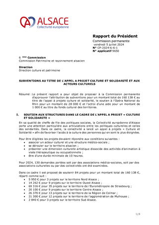 Dans le cadre de ses nouvelles orientations pour la culture votées en février 2022, la Collectivité européenne d’Alsace a affirmé sa volonté de déployer une politique de la culture comme vecteur de cohésion sociale, d’attractivité des territoires et de rayonnement de l’Alsace. La thématique culture et inclusion fait partie des objectifs transversaux avec pour objectif de consolider le rôle de la culture comme levier de cohésion sociale et d’insertion professionnelle en portant une attention particulière aux articulations entre les politiques culturelles et celles des solidarités. Dans ce cadre, il est proposé de lancer un appel à projet « Culture et solidarité » pour favoriser l’accès à la culture des personnes éloignées de l’offre artistique et culturelle. L’objectif est de promouvoir les pratiques artistiques et culturelles qui contribuent à l’épanouissement individuel et collectif en améliorant l’estime de soi et en créant du lien social. Il est également proposé d'attribuer des subventions de fonctionnement à 3 structures pour un montant total de 88 500 €. Ces propositions ont fait l'objet d'un avis favorable de la Commission Patrimoine et rayonnement alsacien du 25 novembre 2022.