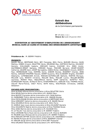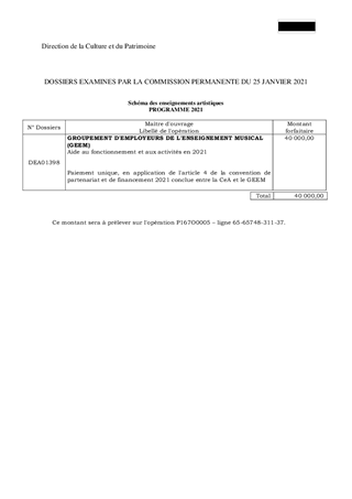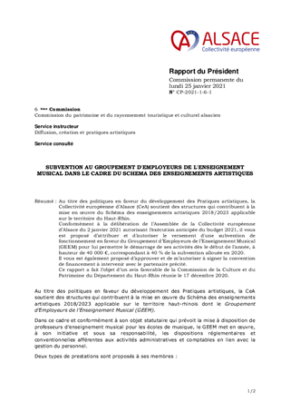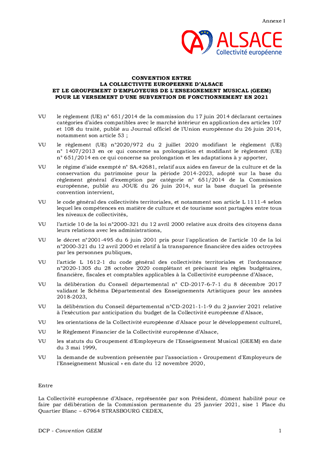 Au titre des politiques en faveur du développement des Pratiques artistiques, la Collectivité européenne d’Alsace (CeA) soutient des structures qui contribuent à la mise en œuvre du Schéma des enseignements artistiques 2018/2023 applicable sur le territoire du Haut-Rhin. Conformément à la délibération de l’Assemblée de la Collectivité européenne d’Alsace du 2 janvier 2021 autorisant l’exécution anticipée du budget 2021, il vous est proposé d’attribuer et d’autoriser le versement d'une subvention de fonctionnement en faveur du Groupement d’Employeurs de l’Enseignement Musical (GEEM) pour lui permettre le démarrage de ses activités dès le début de l’année, à hauteur de 40 000 €, correspondant à 40 % de la subvention allouée en 2020. Il vous est également proposé d’approuver et de m’autoriser à signer la convention de financement à intervenir avec le partenaire précité. Ce rapport a fait l’objet d’un avis favorable de la Commission de la Culture et du Patrimoine du Département du Haut-Rhin réunie le 17 décembre 2020.