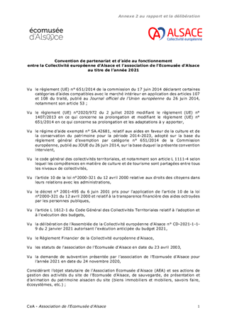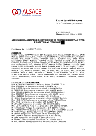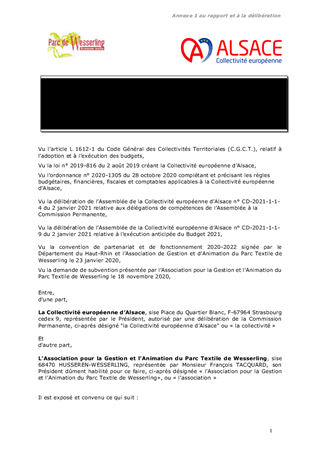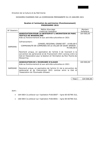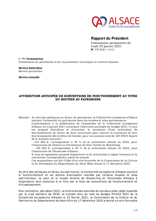 Au titre des politiques en faveur du patrimoine, la Collectivité européenne d’Alsace soutient l’animation du patrimoine dans les musées et sites patrimoniaux. Conformément à la délibération de l’Assemblée de la Collectivité européenne d’Alsace du 2 janvier 2021 autorisant l’exécution anticipée du budget 2021, il vous est proposé d’attribuer et d’autoriser le versement d’une subvention de fonctionnement en faveur de deux structures pour assurer la continuité de leur fonctionnement dès le début de l’année, pour un montant total de 324 000 € réparti de la manière suivante : - 164 000 €, correspondant à 40 % de la subvention allouée en 2020, pour l’Association de Gestion et d’Animation du Parc Textile de Wesserling, - 160 000 €, correspondant à 40 % de la subvention allouée en 2020, pour l’Association de l’Ecomusée d’Alsace Il vous est également proposé d’approuver et de m’autoriser à signer l’avenant et la convention correspondants, joints en annexe. Ces propositions ont fait l’objet d’un avis favorable de la Commission de la Culture et du Patrimoine du Département du Haut-Rhin réunie le 17 décembre 2020.