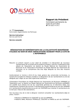 Le présent rapport a pour objet de procéder à la désignation de nouveaux représentants de la Collectivité européenne d'Alsace, suite aux modifications des statuts de l'Association de Gestion du Musée National de l'Automobile de Mulhouse et de l'Association Propriétaire du Musée National de l'Automobile de Mulhouse, et en complément des élus déjà désignés au titre des missions confiées.