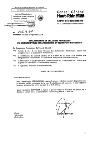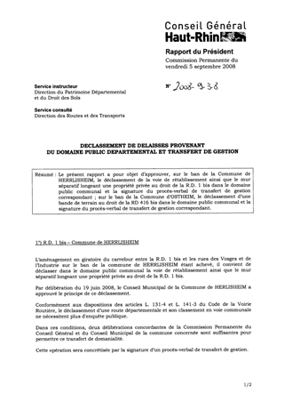 Le présent rapport a pour objet d’approuver, sur le ban de la Commune de HERRLISHEIM, le déclassement de la voie de rétablissement ainsi que le mur séparatif longeant une propriété privée au droit de la R.D. 1 bis dans le domaine public communal et la signature du procès-verbal de transfert de gestion correspondant ; sur le ban de la Commune d’OSTHEIM, le déclassement d’une bande de terrain au droit de la RD 416 bis dans le domaine public communal et la signature du procès-verbal de transfert de gestion correspondant.