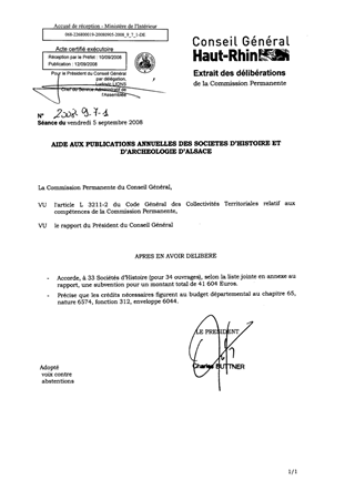Un crédit de 51 000 € est inscrit pour l’aide aux publications annuelles des Sociétés d’Histoire et d’Archéologie d’Alsace. Il vous est proposé de vous prononcer sur l’octroi de cette aide à 33 sociétés (pour 34 ouvrages) ayant publié en 2007, selon la liste jointe en annexe au rapport