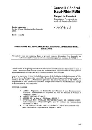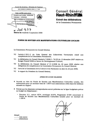 Il vous est proposé de délibérer sur la participation du Département au fonctionnement des deux Conservatoires à rayonnement départemental de Colmar et de Mulhouse au titre de l’exercice 2008 et d’allouer une subvention respectivement de 110 000 € à la Ville Colmar et de 111 000 € à la Ville de Mulhouse pour le fonctionnement de leur structure.