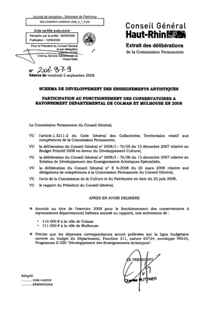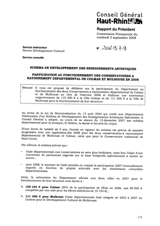 SCHEMA DE DEVELOPPEMENT DES ENSEIGNEMENTS ARTISTIQUES SPECIALISES PARTICIPATION AU FONCTIONNEMENT DES CONSERVATOIRES A RAYONNEMENT DEPARTEMENTAL DE COLMAR ET MULHOUSE EN 2008