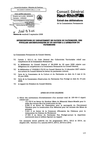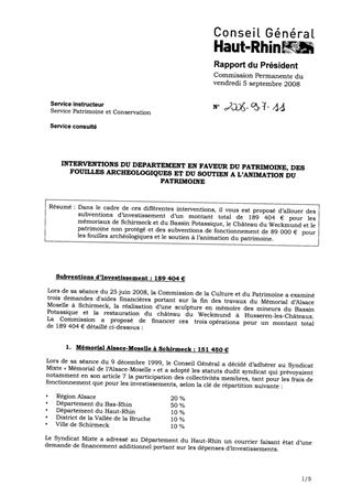 Dans le cadre de ces différentes interventions, il vous est proposé d’allouer des subventions d’investissement d’un montant total de 189 404 € pour les mémoriaux de Schirmeck et du Bassin Potassique, le Château du Weckmund et le patrimoine non protégé et des subventions de fonctionnement de 89 000 € pour les fouilles archéologiques et le soutien à l’animation du patrimoine.