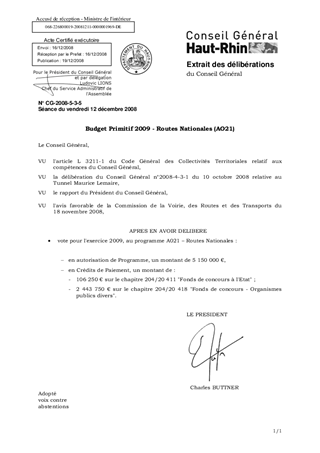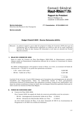 Le présent rapport a pour objet de proposer le bilan de l'exercice 2008 ainsi que la contribution que le Département apportera en 2009 au titre de la voirie nationale (Contrat de Plan) et aux travaux de rénovation et de mise en sécurité du Tunnel Maurice Lemaire.