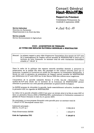Le présent rapport a pour objet d'approuver l’acquisition d’un terrain de 9,97 ares lié à l’aménagement de l’espace naturel sensible de WESTHALTEN et situé sur le territoire de cette Commune. Le montant total de cette transaction immobilière s'établit à 7 184,87 €