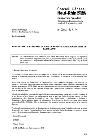 La Communauté de Communes des Trois Frontières nous propose la signature d'une convention de partenariat pour le financement de la navette EuroAirport - gare de Saint Louis. L'engagement financier du Conseil Général est de 142 197,28 euros pour 2008.