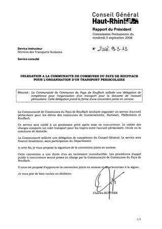 La Communauté de Communes du Pays de Rouffach sollicite une délégation de compétence pour l'organisation d'un transport pour la desserte de l'accueil périscolaire. Cette délégation prend la forme d'une convention jointe en annexe.