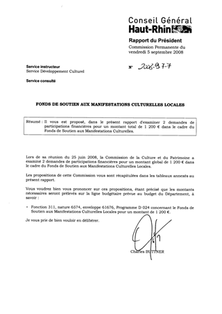 Il vous est proposé, dans le présent rapport d'examiner 2 demandes de participations financières pour un montant total de 1 200 € dans le cadre du Fonds de Soutien aux Manifestations Culturelles