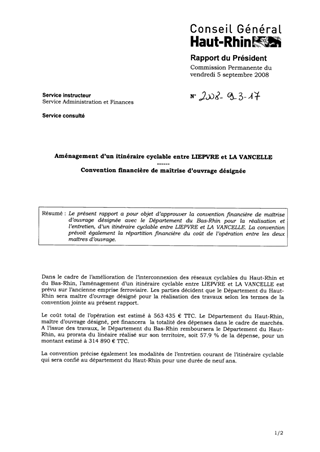 Le présent rapport a pour objet d’approuver la convention financière de maîtrise d’ouvrage désignée avec le Département du Bas-Rhin pour la réalisation et l’entretien, d’un itinéraire cyclable entre LIEPVRE et LA VANCELLE. La convention prévoit également la répartition financière du coût de l’opération entre les deux maîtres d’ouvrage.