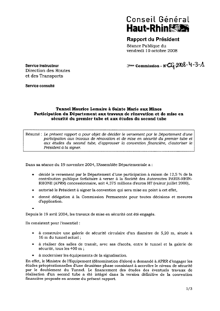 TUNNEL MAURICE LEMAIRE A SAINTE MARIE AUX MINES PARTICIPATION DU DEPARTEMENT AUX TRAVAUX DE RENOVATION ET DE MISE EN SECURITE DU PREMIER TUBE ET AUX ETUDES DU SECOND TUBE