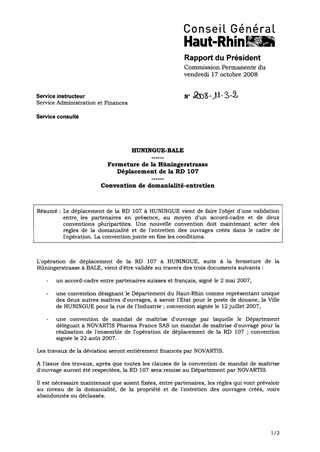 HUNINGUE-BALE ------ FERMETURE DE LA HÜNINGERSTRASSE DEPLACEMENT DE LA RD 107 ------ CONVENTION DE DOMANIALITE-ENTRETIEN