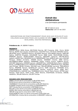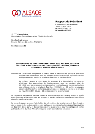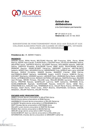 SUBVENTIONS DE FONCTIONNEMENT POUR 2023 AUX ÉCOLES ET AUX COLLÈGES ALSACIENS POUR LES CLASSES DE DÉCOUVERTE, VOYAGES SCOLAIRES, VISITES MÉMORIELLES
