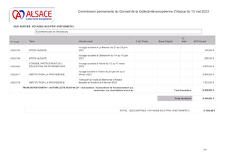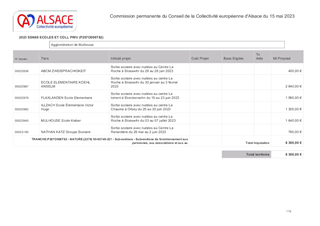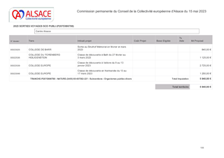 La Collectivité européenne d’Alsace, dans le cadre de sa politique éducative attribue des subventions pour les voyages et sorties scolaires organisés par les collèges et écoles publics et privés du Bas-Rhin et du Haut-Rhin. Le présent rapport a pour objet de proposer à la Commission permanente d’attribuer des subventions de fonctionnement pour un montant total de 66 189 € pour les voyages et sorties scolaires vers les lieux de mémoire alsaciens des collèges publics et privés du Bas-Rhin (2038 élèves - 28 sorties et voyages scolaires) et les sorties scolaires avec nuitées pour les écoles publiques et privées du Haut-Rhin (574 élèves – 15 sorties scolaires avec nuitées).