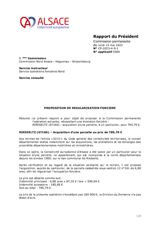 Le présent rapport a pour objet de proposer à la Commission permanente l'opération suivante, nécessitant une évolution foncière : RIEDSELTZ (67160) - acquisition d’une parcelle, à un particulier, pour 785,79 €.