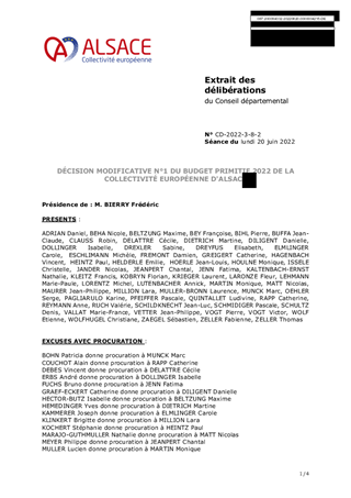 Le présent rapport a pour objet de proposer à l'Assemblée de la Collectivité européenne d’Alsace d'adopter la décision modificative n°1 (budget supplémentaire) de l’exercice 2022 par l’affectation définitive du résultat 2021, ainsi que par l’adoption de nouvelles inscriptions budgétaires pour le budget principal et les budgets annexes.