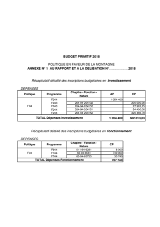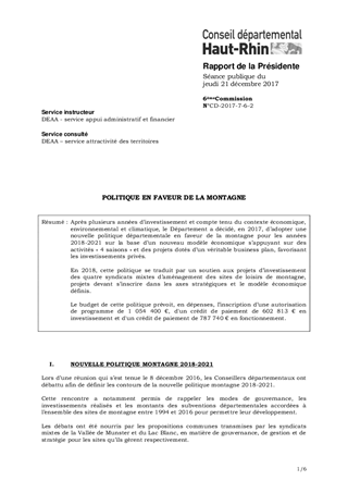 Après plusieurs années d’investissement et compte tenu du contexte économique, environnemental et climatique, le Département a décidé, en 2017, d’adopter une nouvelle politique départementale en faveur de la montagne pour les années 2018-2021 sur la base d’un nouveau modèle économique s’appuyant sur des activités « 4 saisons » et des projets dotés d’un véritable business plan, favorisant les investissements privés. En 2018, cette politique se traduit par un soutien aux projets d’investissement des quatre syndicats mixtes d’aménagement des sites de loisirs de montagne, projets devant s’inscrire dans les axes stratégiques et le modèle économique définis. Le budget de cette politique prévoit, en dépenses, l’inscription d’une autorisation de programme de 1 054 400 €, d'un crédit de paiement de 602 813 € en investissement et d'un crédit de paiement de 787 740 € en fonctionnement.