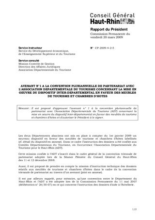 AVENANT N°1 A LA CONVENTION PLURIANNUELLE DE PARTENARIAT AVEC L'ASSOCIATION DEPARTEMENTALE DU TOURISME CONCERNANT LA MISE EN OEUVRE DU DISPOSITIF INTER-DEPARTEMENTAL EN FAVEUR DES MEUBLES DE TOURISME ET CHAMBRES D'HOTES